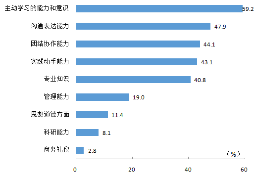 分单位性质看,机关事业单位较看重工作责任心(42.9%)和沟通表达能力(40%),分别较平均值高出7.8个、17.7个百分点;外资企业较看重主动学习能力(35.3%),较平均值高出10.7个百分点;国有企业较看重适应能力(59.1%)和业务能力(54.6%),分别较平均值高出25.4个和21.4个百分点;私营企业较看重专业水平(56.5%),较平均值高出9.1个百分点。